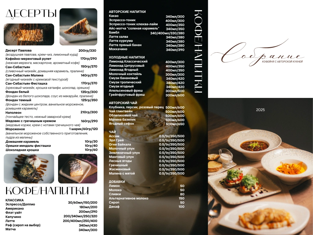 Вкусный напиток и десерт — это не просто часть трапезы, а способ сделать день особенным. В этом разделе вы найдете не только привычные вам угощения, но и авторские напитки, которые способны удивить и подарить новые впечатления. Напитки. В «Собрании» мы ставим акцент на разнообразие вкусов и высокое качество каждого напитка. Независимо от того, выберете ли вы чашечку насыщенного кофе, легкий чай или освежающий смузи, мы гарантируем, что каждый напиток будет приготовлен с любовью и вниманием к деталям. В нашем меню — как классические напитки, так и авторские, которые идеально дополнят атмосферу вашего дня. Десерты. Никогда не бывает лишним найти момент для сладости. Мы гордимся тем, что в «Собрании» каждая порция десерта — это маленькая радость, сделанная с душой. Наши кондитерские изделия подходят для любого настроения — от легких пирожных до сытных изделий, каждый кусочек создаст настроение и придаст завершенность любому приему пищи. В нашем меню мы собрали идеальные сочетания, которые подойдут для самых разных моментов: для утреннего кофе с друзьями, для угощения на деловых встречах или просто для тихого отдыха в одиночестве. Пусть каждый глоток и каждый укус будут приносить вам удовольствие!